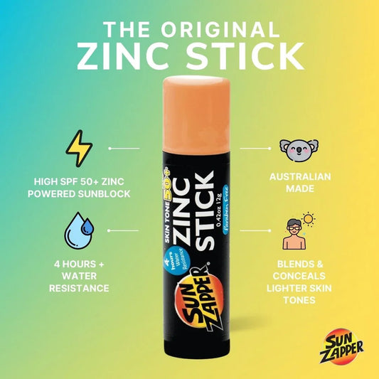 The Sun Zapper Zinc Stick is a must have to protect yourself against harsh sun. Join thousands of legends around the world who trust in our Aussie made SPF 50+ sunblock stick. Available in various skin tones to blend in and conceal or fun colours to match your style.