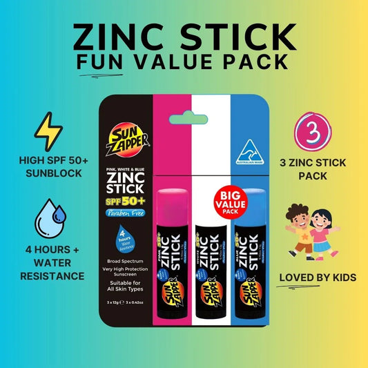 Did somebody say 4 hours water resistance? Dive into your water adventures with confidence using the Sun Zapper Zinc Stick! This Aussie-made powerhouse offers unbeatable SPF 50+ protection and stays put for over 4 hours in the water, making it perfect for swimming, surfing, or any water-based activities. Powered by mineral zinc oxide and titanium dioxide, our sticks provide superior protection against UVA and UVB rays while being gentle on sensitive skin. Whether you're hitting the beach or enjoying a sunny day out, the Sun Zapper Zinc Stick has got you covered, ensuring long-lasting protection and carefree fun in the sun